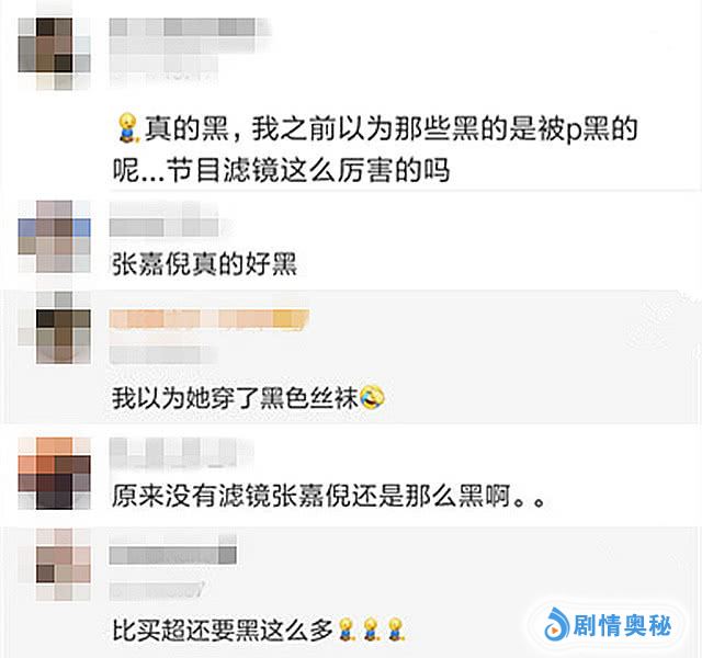 对比现场的一个女孩的腿部肤色更一目了然,虽然有灯光影响的成分,但张嘉倪的肤色的确不白,有网友评论“以为她穿了黑色丝袜”,弹幕上也有很多网友感叹张嘉倪太黑了。