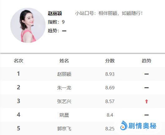 这是目前热度评分最高的五位演员,这五位优秀的电视演员依次是8.93分的赵丽颖、8.69分的朱一龙、8.57分的张艺兴、8.4分的姚晨,以及8.25分的郭京飞,其中安心养身子的赵丽颖连续多期霸榜,这是颖宝粉丝对赵丽颖深深的爱,此外即将出山的朱一龙稳居次席,在新剧《黄金瞳》中秀出演技的张艺兴重回前三,主演《都挺好》的实力派演员姚晨和郭京飞分别排在第四名和第五名,姚晨的排名不变,郭京飞排名有所下滑。