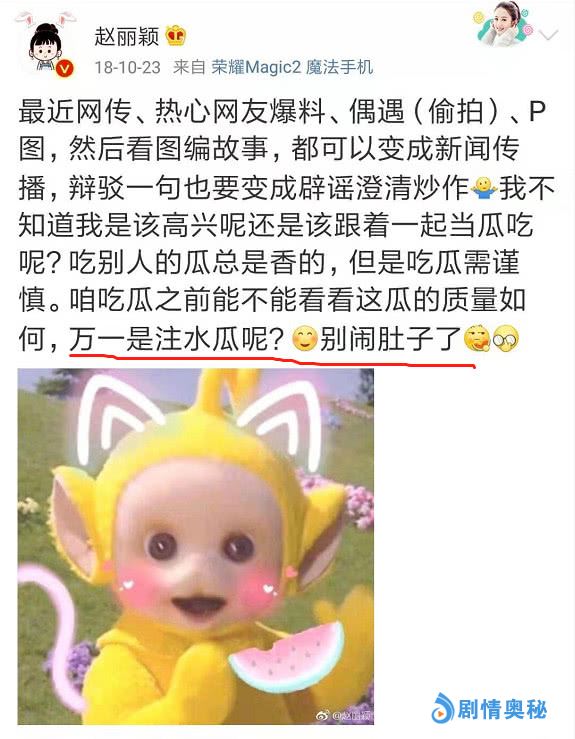 赵丽颖否认的方式也真是花样百出,起初是以“劈叉”照作为回应。后来媒体再传她怀孕,她又在微博上贴出一张“注水瓜”的图片,再次否认和回击了怀孕传闻。但在否认后不久,赵丽颖和冯绍峰又在微博上官宣了怀孕的喜讯,这波操作既让维护她的粉丝变得不知所措,同时也让部分网友开始对她产生反感,甚至质疑她和冯绍峰借机炒作。