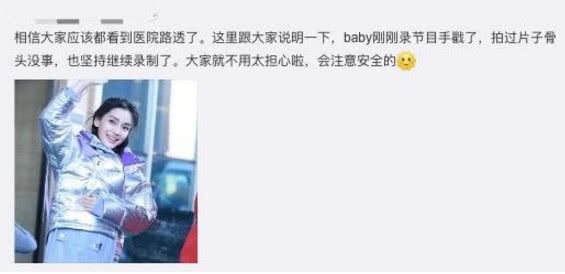在鞍山录制的时候有小伙伴在医院偶遇了baby,还很焦急的在网上询问发生了什么。虽然没有拍到正脸,但是也可以看到她服装上的名牌,而且有很多工作人员助理跟着。随后就有说是因为她录制节目的时候手受伤了,不小心戳到了,检查过后也发现没有大家想象的那么严重,骨头没事,而且最敬业的还是她受伤了都继续录制节目。
