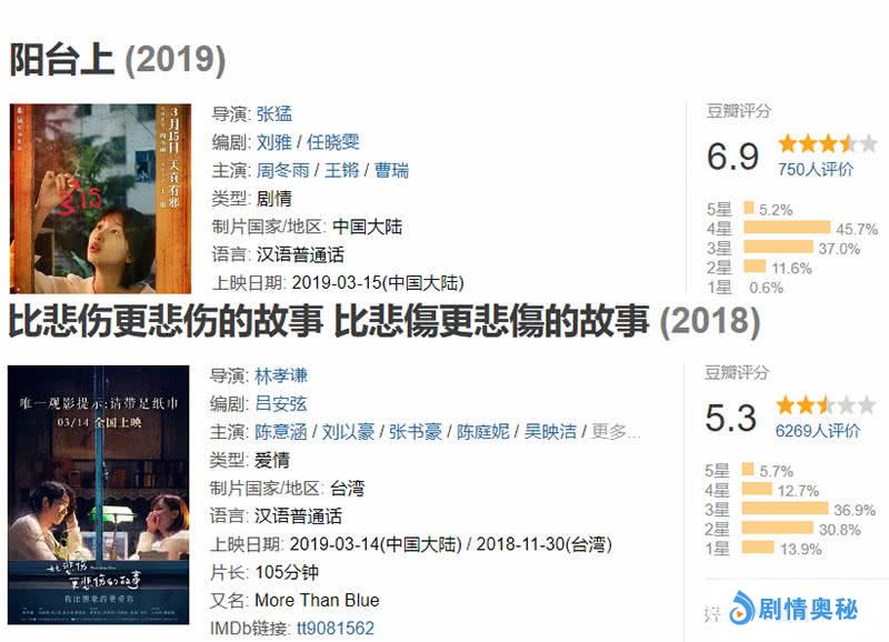而从豆瓣网上传来的数据分析,《比悲伤更悲伤的故事》豆瓣仅5.3分,电影《阳台上》则达到了6.9分,这样看来,对比陈意涵,周冬雨赢得口碑,却输掉了票房。