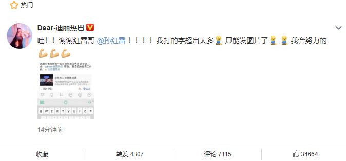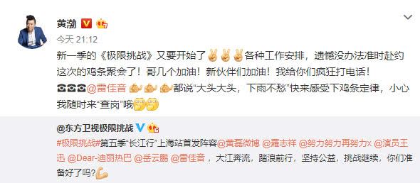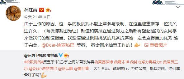 稍晚离开《极限挑战》的孙红雷更新动态,一同更新动态的还有黄渤,其中孙红雷透露自己因为工作安排,不得不离开《极限挑战》,他要向大家推荐迪丽热巴,并直言迪丽热巴的颜值和演技都可以在努力后有望超越自己,成为《极限挑战》的颜值担当,并且要迪丽热巴等他,他会回来抽查工作,黄渤更新的动态与孙红雷相似,不同的是他推荐的明星嘉宾不是迪丽热巴,而是“大头”雷佳音。其中“我会回来抽查工作的”,这句话点燃粉丝的希望,也许他和黄渤还会回来。