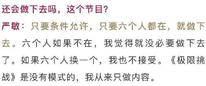 在许多观众的心中,《极限挑战》的核心是极限男人帮,而极限男人帮由黄渤、孙红雷、黄磊、张艺兴、王迅、罗志祥组成,这六个人缺一不可,可在《极限挑战》第五季嘉宾名单中,我们没有看到孙红雷和黄渤的名字,不止如此,还有三位新嘉宾加盟,他们分别是迪丽热巴、雷佳音、岳云鹏,此外“极限挑战总导演严敏离职”和“黄渤孙红雷缺席极限挑战”空降热搜,他遵守了自己的诺言。