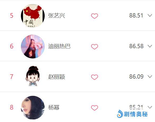 排在第5~第8名的四位娱乐圈明星依次是张艺兴、迪丽热巴、赵丽颖、杨幂,其中参与录制人气综艺《极限挑战》的张艺兴迪丽热巴分别排在第五名和第六名,安心养身子的赵丽颖紧随其后,杨幂位列第八。
