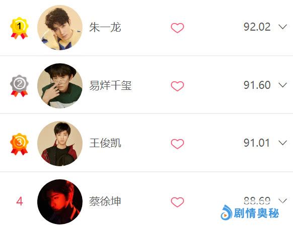 这是目前流量最多的四位明星,他们依次是出演《天网行动》的朱一龙、加盟《大冰小将》的易烊千玺、忙于公益事业的王俊凯,以及与潘长江一起空降热搜的蔡徐坤,其中热度评分超过92分的朱一龙还是第一名,易烊千玺王俊凯评分全部突破91分,用四个字形容就是“年少有为”。
