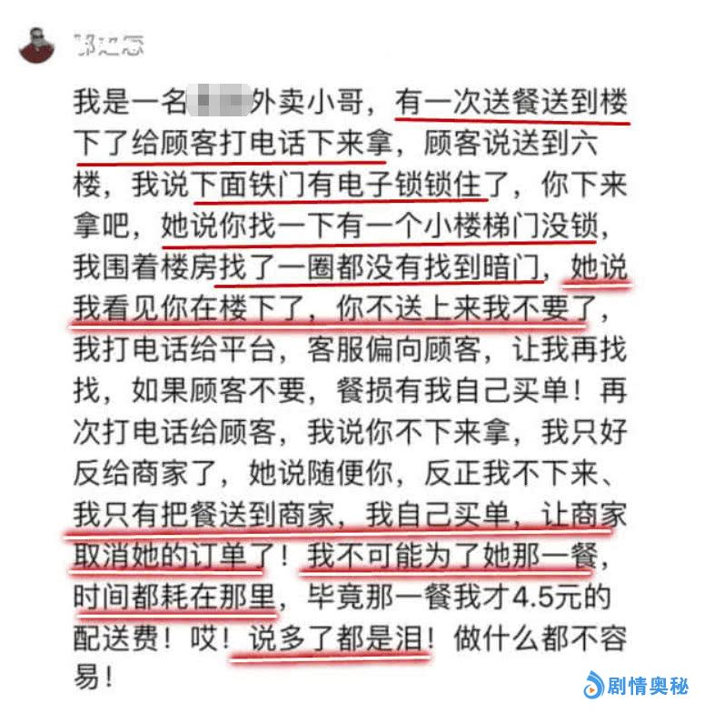 在外送餐饮业不断发展的过程中,顾客与卖家之间总会存在一些无法控制的矛盾。除了公共和私人之外,他们只能被卖家妥协。毕竟,他们为客户服务,但如果他们遇到不合理的客户,他们应该如何回应?在大多数情况下,外卖员都会选择妥协。最近,一些网友出来投稿了这样一个悲伤的故事。