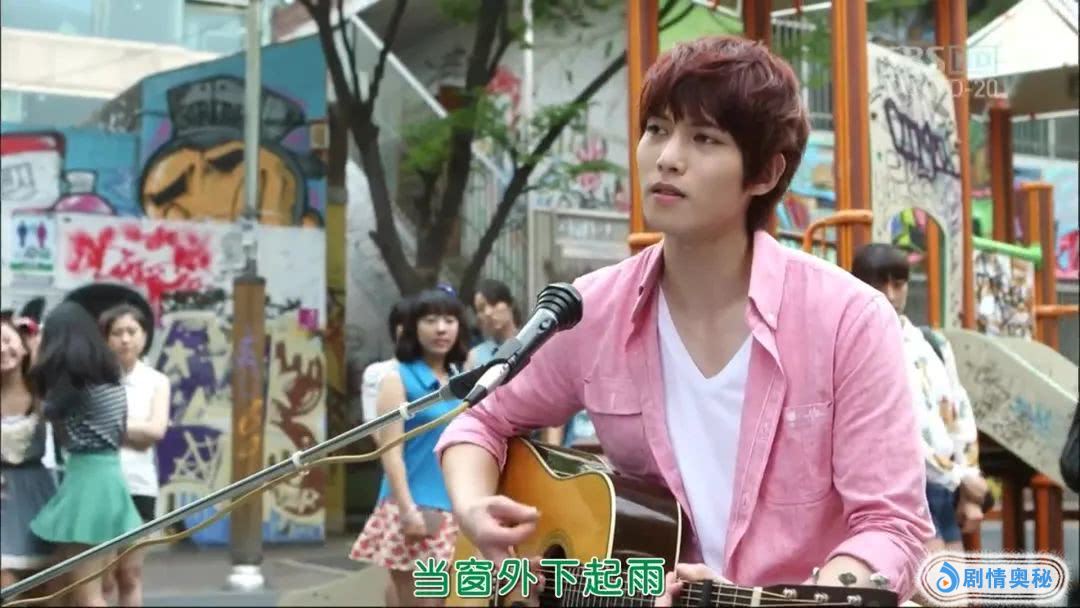 在《绅士的品格》里的街头,拿着吉他,自弹自唱。