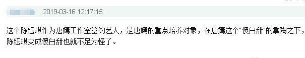 更有人认为陈钰琪饰演的赵敏在大多时间都没有演出这个角色的直率豪爽,果敢坚决,除了出场击杀欺负百姓的元兵外大多数时间更像一个“傻白甜”,更有人将矛盾指向唐嫣,导致唐嫣无端被连累而受到嘲讽,他认为陈钰琪作为唐嫣工作室签约艺人,是唐嫣的重点培养对象,在唐嫣这个“傻白甜”的熏陶之下,陈钰琪变成傻白甜也就不足为怪了。