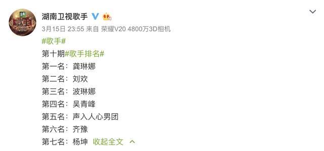 本期《歌手》官方排位从高到低如下:龚琳娜、刘欢、波琳娜、吴青峰、声入人心男团、齐豫、杨坤。个人心目中的排位为:龚琳娜、刘欢、波琳娜、齐豫、声入人心男团、杨坤。