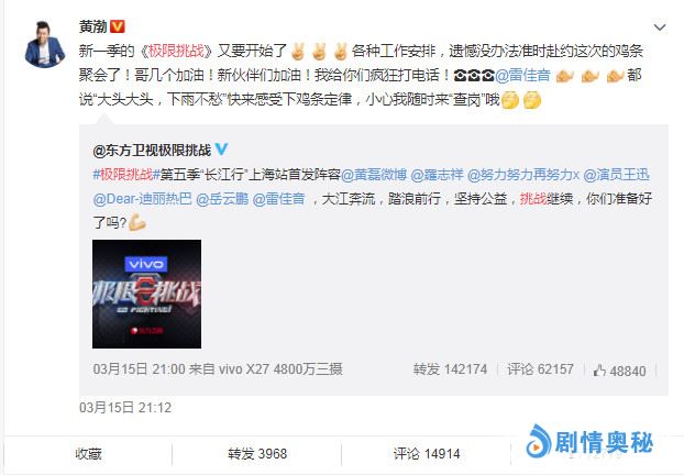 在确定离开《极限挑战》后,黄渤微博发文称,自己由于各种工作安排,遗憾没办法准时赴约这次聚会了,希望新成员充满信心,鼓励他们发挥水平,收获成功。最后还说道,会不定期的来查岗。孙红雷苏以后也表示是因为工作没有办法参加,于是推荐了颜值了演技都超过他的迪丽热巴来作为颜值担当。只是不知道两人会不会偶尔来当一下飞行嘉宾呢?