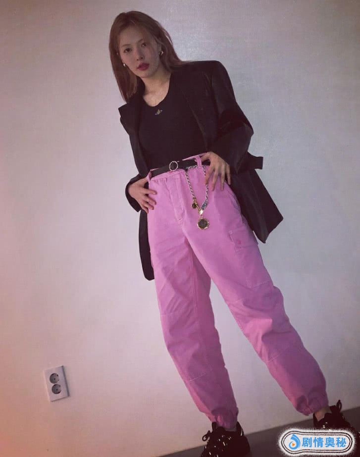 泫雅还有别的打扮,她这次穿了黑色打底衫,搭配了一件黑色西装,穿着也很时尚,还穿了一条玫红色的裤子,这裤子有点像哈伦裤的感觉,她穿着这条裤子很时尚,还穿着黑色的鞋子,更潮流了呢。