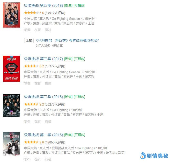 我们知道与《奔跑吧》相比,《极限挑战》一路走来极为坎坷,一次又一次的停播风波让《极限挑战》无力招架,为了生存,《极限挑战》开始更换节目内容,这也使得《极限挑战》口碑在直线下滑,我们可以看到《极限挑战》第一季到第四季的豆瓣评分在直线下滑,到了第四季,从第一季的9.0分,到第二季的9.2分,再到第四季的7.6分,我们有理由相信第五季的《极限挑战》豆瓣评分将跌破7.0大关。