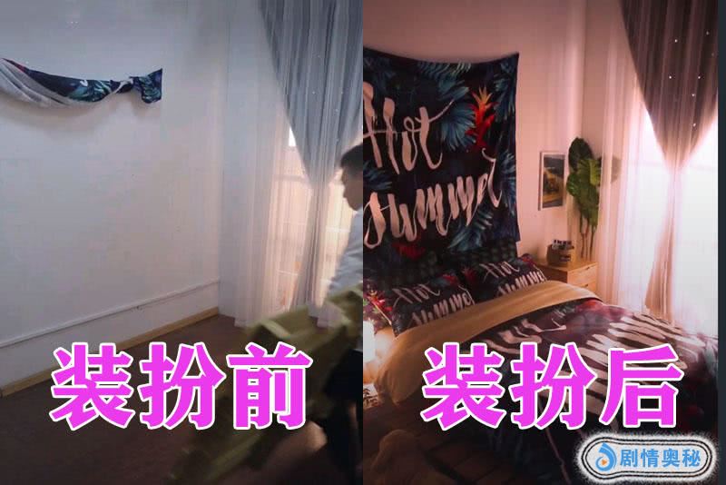 首先我们来看一下这间房间,这个房间装扮之前是空空荡荡的,只有在墙上挂了一片布,感觉就像是一间杂货屋一样,但是在装扮之后,我们可以看到安装了一个床还有柜子,还有一些日常用品,灯具什么的。床头柜那边还挂上了一幅画,看起来整个房间非常的温馨。