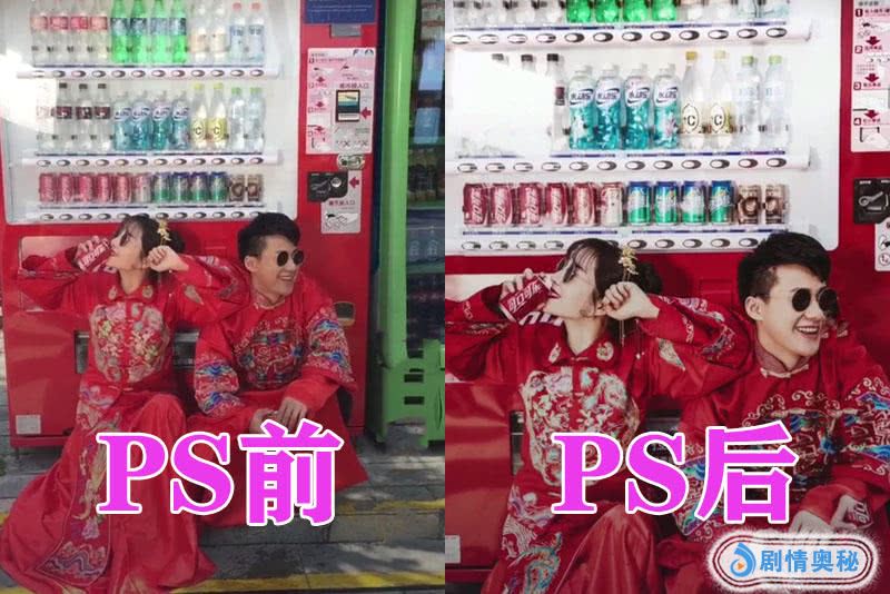 首先我们来看一下第1张照片吧,我们可以看到这张照片在PS之前是非常普通的,两个人蹲在饮料机前面,新娘子在喝可乐,没有什么特点,但是在PS之后这张照片就显得非常漂亮了,我们可以看到经过PS的强大功能,这张照片的颜色变得非常的鲜艳,所以给人眼前一亮的感觉。