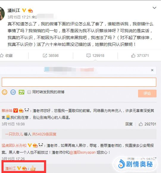 也许是因为忍受不住自己的微博被攻击,潘长江老师直接发了一个微博,表示不知道为什么自己的微博评论会变成这个样子,难道就因为自己不认识蔡徐坤吗?还表示自己姓蔡的,他只认识蔡明。看到了潘长江老师如此的较真,蔡徐坤也只好亲自过来解释了,却不并没有得到回应。