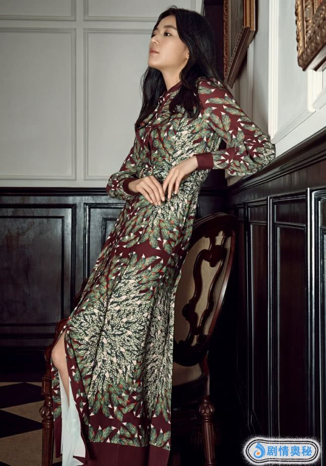 这次全智贤穿了一条深绿色的印花连衣裙,这裙子很显气质,开叉的设计,看着就很性感,她的腿看上去也很美,搭配了比较优雅的大波浪卷发,看上去很淑女的感觉,她的妆容简单又精致,果然是完美的全智贤女神。