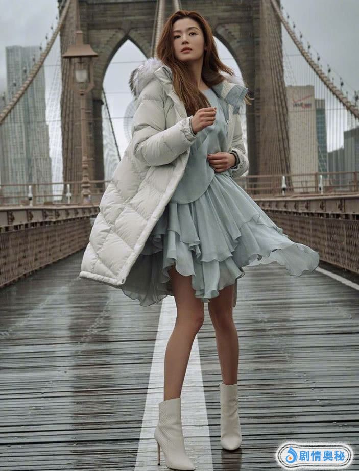 全智贤别的打扮也很美,她穿了一件暗蓝色的裙子,层叠的设计,看上去超级好看,外面是一件白色的羽绒服,她的身材真的很瘦啊,这腿也是没谁了,搭配了一双白色的靴子,大秀性感美腿的节奏啊。