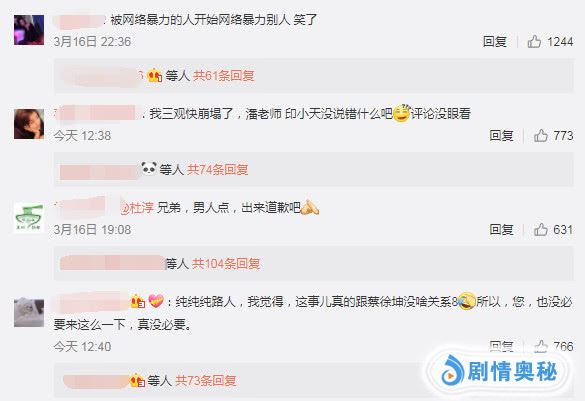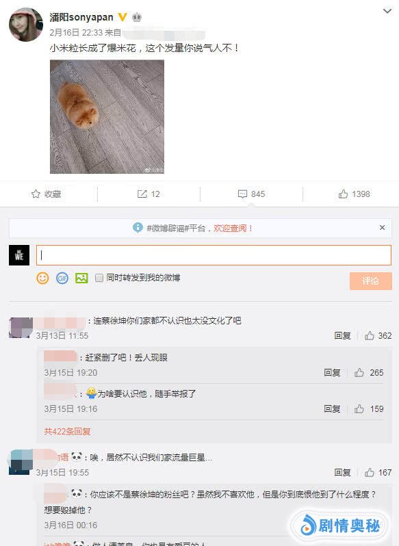 潘阳最新的一条微博是在2月16日,事件发生之后,也有不少所谓的”蔡徐坤粉丝“到她的微博下留言,数量虽然没有潘长江那么多,但是话说的也是相当难听。