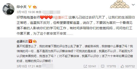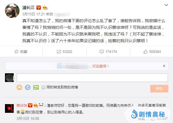 事件发生之后,耿直的潘长江直接在微博上直言“他做错了什么“,并且直言姓蔡的就认识蔡明,当然这一条微博也是获得了蔡徐坤的留言。