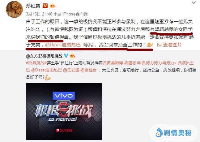 而且孙红雷发文告别《极限挑战》的时候大力力挺迪丽热巴,孙红雷一直在“男人帮”充当“颜值担当”而且孙红雷还喜提了“青岛贵妇”的称号,孙红雷在《极限挑战》中一直十分矫情而且总是不按套路出牌给网友们不一样的惊喜因而圈了不少粉丝。这次孙红雷发文只为迪丽热巴一人打call,而对雷佳音和岳云鹏毫无回应。可见孙红雷十分看重迪丽热巴。