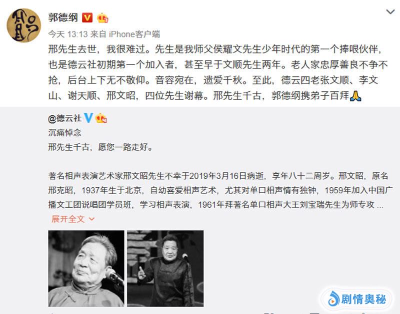 3月16日,对德云社来说是个悲痛的日子,其老字辈成员邢文昭先生因病去世,享年八十二周岁。在17日当天,郭德纲及德云社小字辈的弟子们都在个人媒体平台进行了哀悼。