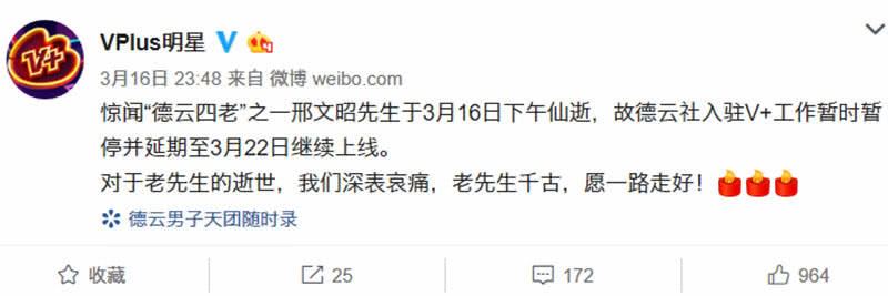 而就在前几天,德云社一直在宣传3个重要活动,其中之一就是入驻V+工作,这也是国内相声演员初次尝试新兴的粉丝经纪模式,为德云社的整体商业运营开辟一个崭新的途径。但是,因为邢文昭先生的突然离世,V+官方已经声明与德云社的合作将延后一周,以此表达对邢文昭先生的哀思。连这么重要的活动都延期了,估计这一周之内,德云社或将全面禁娱,来操办这次丧事。