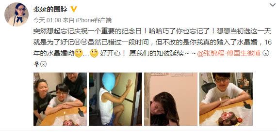 从张延的微博动态中可以看到,她和老公都忘记了这个纪念日,所以,等到他们想起时已经错过一段时间,因此,事后想起的张延也买了一小块蛋糕,一家三口聚在一起庆祝他们的水晶婚。