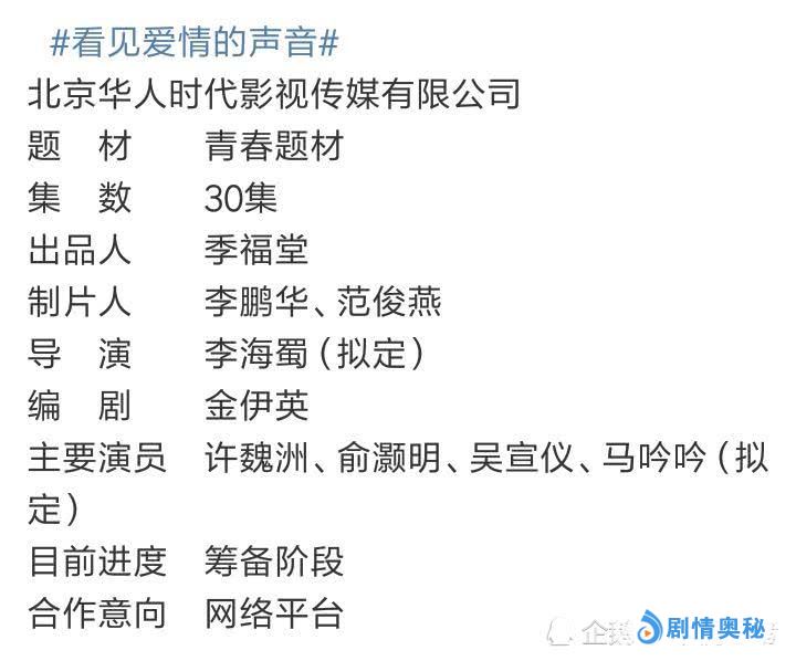 最近有一部新剧正在筹备当中,那就是由北京华人时代影视担任出品的《看见爱情的声音》了。这部剧是青春励志题材的作品,暂定在2019年上半年开机拍摄。而目前这部剧当中的主演阵容,邀请到了几位当红演员加盟。