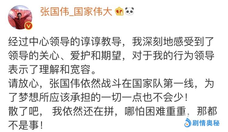3月17日晚,张国伟本人在微博中对此事做出回应,其微博原文如下:经过中心领导的谆谆教导,我深刻地感受到了领导的关心、爱护和期望,对于我的行为领导表示了理解和宽容。请放心,张国伟依然战斗在国家队第一线,为了梦想所应该承担的一切一点也不会少!散了吧, 我依然还在拼,哪怕困难重重,那都不是事!