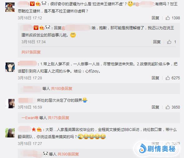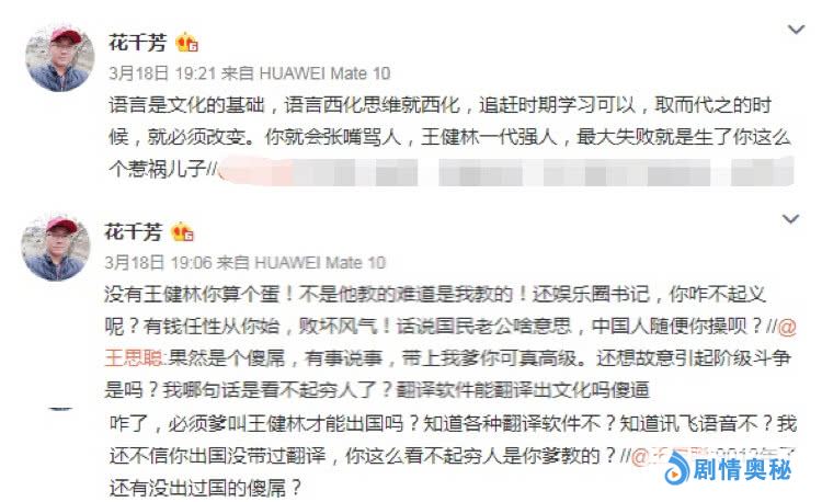 但接下来花千芳的语言也很不妥当“咋了,必须爹叫王健林才能出国吗?知道各种翻译软件不?知道讯飞语音不?我还不信你出国没带过翻译,你这么看不起穷人是你爹教的?”你们两个人吵架,扯上人家父亲就不对了。