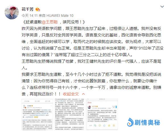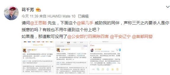 大概是花千芳觉得昨晚的帖子说的还不太清楚,19日早上又发表了相关解释的帖子,并再次让王思聪给他道歉。大概王校长是吵累了,也不想吵了。之后没有再发表言论。但是花千芳却贴出了自己朋友受到人身威胁的帖子截图。并指出威胁他的人,很有可能是某人派来的,还劝说威胁他的人不要引火烧身。