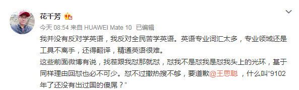 草根农民作家花千芳在3月17日连发三条关于“学习英语无用”的言论,引来上万网友讨论。评论区的观点几乎是一致的,都认为花千芳的观点不对。第一,因为英语现在是世界通用语言,要想走出去,必须会英语。第二,很多行业都要接触英语,不止是翻译和教师行业,其他比如计算机、医药等行业都要用到英语。第三,无论是学英语还是数学,都是为将来打基础。打个比方,一位刚上学的小孩,他只有学的知识全面了,将来才能有更大的余地,更好的准备,去选择要从事的行业。第四,因为学会英语,可以看和接触很多英语原文的著作和资料,对工作和学习都是有益处的。