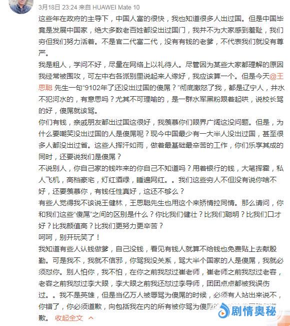 花千芳认为王思聪瞧不起穷人,瞧不起未出过国的人。王思聪指责花千芳故意从字面上扭曲含义,想激化矛盾,反正是各不相让。眼看事态有越来越大的趋势,花千芳再次于3月18日晚间发了一篇长文,大致观点,第一还是纠结在有钱没钱的问题上。第二还是挑理,指责王思聪骂他“傻屌”,也接受不了。第三说人家王思聪家里的钱来的也不光明正大。第四表明自己怼过的名人不少,有水军黑自己也不怕。