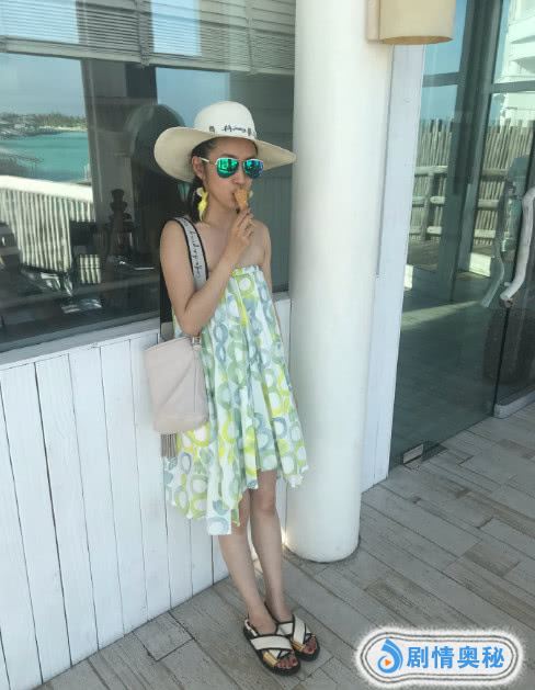 从林依晨晒出的度假照来看,身着绿色花纹小裙,头戴遮阳帽,面戴墨镜的她晒黑了一些,照片中倚靠在窗边吃冰淇淋的林依晨,老公镜头下的她也是少女感十足。