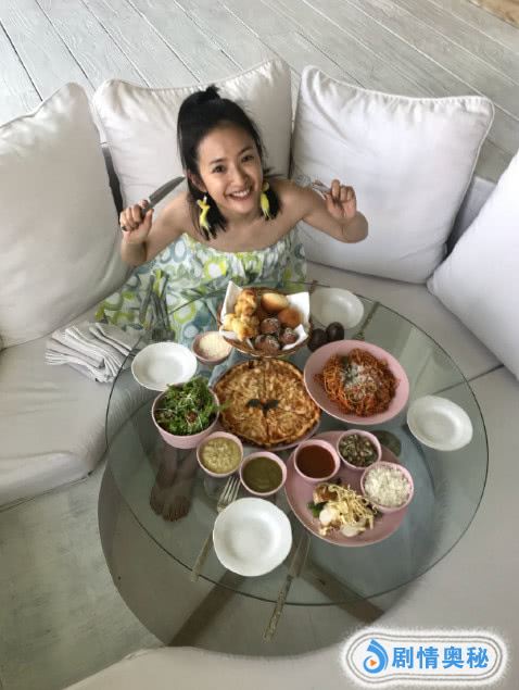 坐在摆满美食的餐桌旁,一手拿刀一手拿叉对镜头露出灿烂笑容的林依晨很是俏皮可爱,活力四射,就像是长不大的孩子。