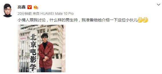 高鑫在微博中写到:“小情人跟我讨论,什么样的男生帅,我准备给她介绍一下这位小伙儿。”
