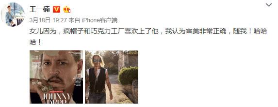 话说,女儿除了与爸爸高鑫讨论什么样的男生帅之外,从高鑫老婆王一楠近日晒出的动态来看,小公主近日也是因疯帽子和巧克力工厂喜欢上了德普。