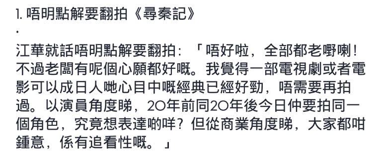 对于不参与拍摄《寻秦记》的电影版,江华就表示:“演员都已经老啦,不过其实有续集的这个念头是很好的,因为经典的剧集,好的电影才会受观众热捧。以演员的角度来看,20年前和20年依旧拍同一个角色,不知道能够表达什么意思。”对于江华不参演《寻秦记》观众都能够理解,只是对于观众来说是一种情怀。