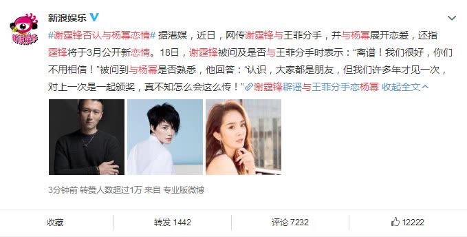谢霆锋昨日接受采访时被记者问到是否与王菲分手,谢霆锋霸气回应称:“离谱!我们很好,你们不用相信那些网络造谣!”被问到与杨幂是否熟悉时,谢霆锋回应称:“认识,大家都是朋友,但我们许多年才见一次,上次见面时是一起领奖的,真不知怎么会这么传的!”谢霆锋亲自否认与杨幂的恋情,而且还表示自己与王菲两人感情很好不需要网友们的担心。