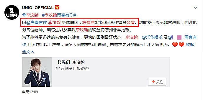 “因李汶翰身体原因,将缺席3月20日合作舞台公演。对此我们表示非常遗憾,同时也对各位老师、训练生以及喜欢李汶翰的粉丝们感到非常抱歉。为了能够更迅速的恢复身体健康,更快的回到最好状态,李汶翰、公司及青春有你共同作出以上决定,感谢大家的支持和理解,未来在更好的舞台上和大家见面。”