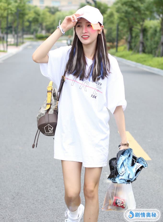 吴宣仪仅穿一件白T,这样看着她只穿了一件衣服,看着她的腿真的好看,她搭配了一双白色的运动鞋,她的鞋子是比较简单的感觉,她的腿看着超级时尚,她手上拿着一些零食,都是很多人爱吃的。