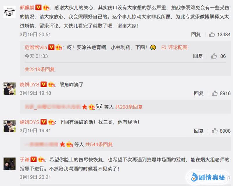 对于粉丝们的关心,郭麒麟也不再隐瞒,并坦言称感谢大伙儿的关心,其实伤口没有那么严重,拍战争戏难免会有一些受伤的情况,请大家放心,我会照顾好自己的。这个事儿惊动大家非我所愿,为此专发条微博解释又太过矫情,留条评论,大伙儿看完了就散了吧,谢谢大家!