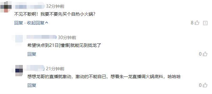 听到朱一龙即将现身直播间的好消息,评论区的粉丝太调皮,有粉丝评论道:不见不散啊!我要不要先买个自热小火锅?有粉丝评论道:希望快点到21日,就能见到拢龙了。还有粉丝评论道:想想龙哥的直播就激动,激动的不能自已,想看朱一龙直播调火锅底料,哈哈哈。看来有很多小伙伴知道朱一龙最爱火锅,那么清汤和麻辣,你知道朱一龙喜欢哪一种吗?