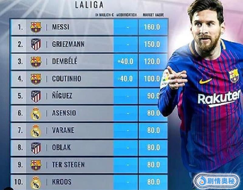 了解足球都知道,一个球员的身价并不等同于他的转会费,比如说像梅西1.6亿的身价,并不是说有球队拿出1.6亿就能买下梅西了,对于那些当打之年的球员来说,转会费肯定要比身价高很多,而对一些不太好的球员,也会出现身价高过自己的转会费。最近德国转会市场更新了西甲的球员身价,大家来瞄一眼。榜单上面,西甲三强完全包揽前十,其中马竞和皇马都有三人,而巴萨成了最大的赢家,拥有四人。