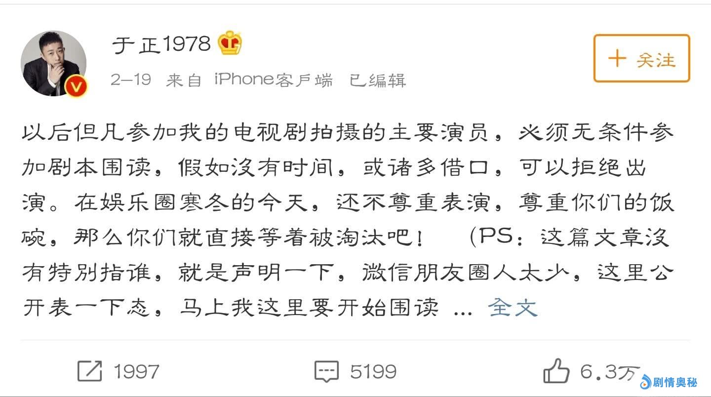 于正这个在社交媒体活跃度太高的人,总会时不时给人点惊喜,上次他于微博发文倡议,要求参加他戏的演员都要进行剧本围读,还表示:假如没有时间,或诸多借口,可以拒绝出演。在娱乐圈寒冬的今天,还不尊重表演,尊重你们的饭碗,那么你们就直接等着被淘汰吧!