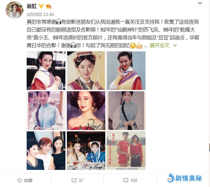 近日,翁虹也在自己的微博中晒出一组照片,这组照片都是她以前塑造过的角色,并且她也写道,很感谢影迷朋友的支持和关注,也没想到大家有一直有收集这些照片,这是很珍贵的回忆,她自己都没有没想到粉丝却收藏了那么久,很感动粉丝的这个行为。