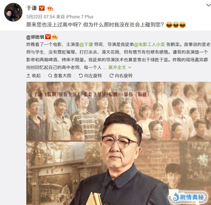 对于老搭档的电影,郭德纲绝对会不遗余力的支持,在看完点映之后,还特意在个人媒体平台发文,先是对徒弟张鹤栾的导演水平进行了肯定,而后又调侃于谦称其表演值一个影帝和两箱啤酒、烤串不限量。另外,郭德纲也顺便自嘲了一下自己的学历,称记得不高中老师的名字,是因为没上过高中。