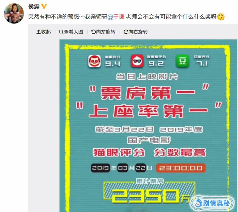 前不久,德云社相声演员侯震也发文称:突然有种“不祥”的预感,我亲师哥于谦老师会不会有可能拿个什么什么奖呀?同时还配上了《老师·好》上映首日票房第一、上座率第一以及猫眼最高评分官方宣传图片。