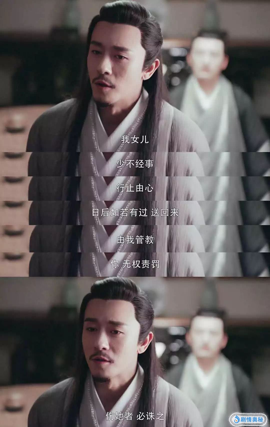 于是,他去见了殷梨亭。他径自坐下,背对殷梨亭,第一句话就是,“她不是晓芙”。这是作为父亲最大的担忧,怕女儿成为了感情里的替代品。他听到殷梨亭的回答后(其实殷梨亭的这段台词,真的是没有什么说服力)为了女儿,他还是眼眶隐约含泪,用颤抖着的手,端起了殷梨亭的茶。在走出门前,他说道:“我女儿,少不经事,行止由心,日后如若有过,送回来,由我管教,你无权责罚,伤她者,必诛之”。