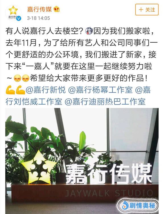 由于前段时间网上一直有传言说,杨幂和刘恺威合作开设的公司“嘉行传媒”人去楼空,甚至还传出杨幂和合伙人不和等传闻,于是嘉行传媒特别通过官微做出澄清,称“人去楼空”是因为搬新家了,换了全新的办公地点,目的是为了给同事提供更好的工作环境。